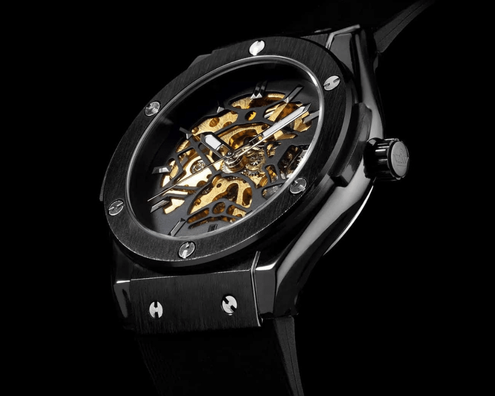 The Lunar Slate blends exposed mechanical design with a brushed steel case and a refined black profile. Featuring a skeleton dial that reveals its inner movement, it delivers a bold yet understated presence. Finished with sapphire crystal and an automatic mechanical engine, it’s built for those who value precision, structure, and modern craftsmanship.