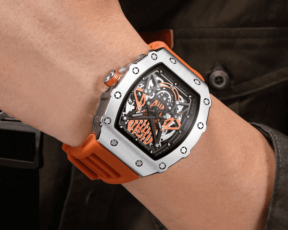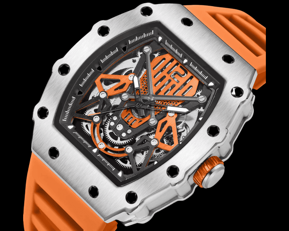 Brushed steel framing, exposed gears, and a vivid orange core create a striking mechanical composition. The integrated silicone strap reinforces its performance attitude. Designed for men who move with precision and intent, powered by a visible hand-wound heartbeat beneath the dial.