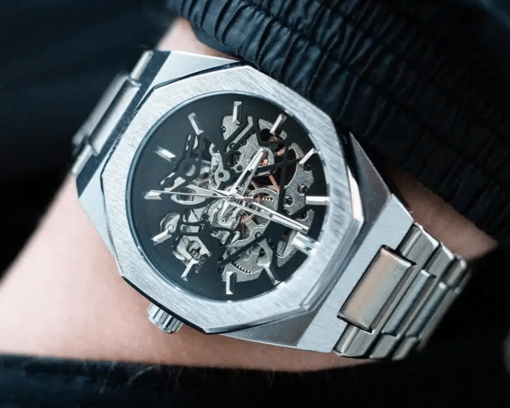 With its brushed silver case, integrated steel bracelet, and fully exposed skeleton dial, Onyx Sky presents a refined industrial aesthetic. The octagonal silhouette and layered mechanics create a sense of depth, designed for those who appreciate structure, precision, and visible complexity beneath a restrained exterior.
