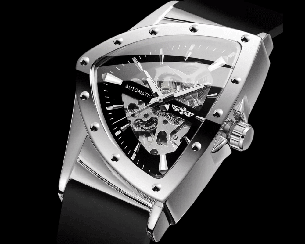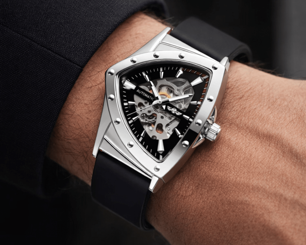 With its irregular triangular silhouette, polished steel surface, and open mechanical core, Triarch feels engineered rather than styled. The black rubber strap grounds the design with modern restraint, made for those who are drawn to structure, precision, and form that challenges convention.